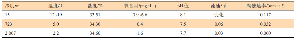 海洋环境下,在金属表面涂装有机涂层是最有效的防腐方法之一。有机涂层紧贴在基材表面,形成一层阻隔层,可以阻隔氧气,并减缓水分子和其他腐蚀性离子的渗透,为基材提供有效的防护。深海环境下,海水中的溶解氧含量、海水流速、温度、盐度、pH值、海水静水压力、生物条件等因素随着海水深度增加而变化,如表1所示。在深海环境中,装备用防腐涂料的防护性能主要受海水静水压力、温度、水渗透、氧及侵蚀性离子的渗透、局部阴极保护异常电位以及杂散电流的影响。其中,深海环境区别于浅海环境的最大特点是深海静水压力与高压下水及侵蚀性离子的渗透。