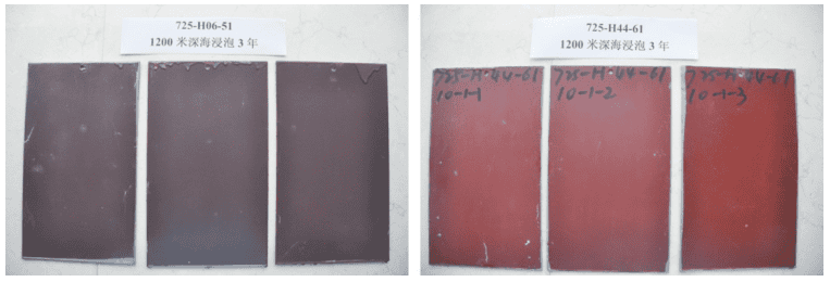 针对深海装备用防腐涂料,国外发达国家海军开展了一些研究工作。2003年,美国海上系统司令部批准INTERGARD 143高固体分环氧涂料用于深海装备的维修防护涂料,提高了深海装备的防腐性能、安全性和可靠性。俄罗斯海军使用E-51液态环氧树脂为基料,酰氨基胺类为固化剂合成的厚浆型涂料,该涂料体积固体分高达98%,涂层干膜厚度>1 mm,涂层柔韧性好,耐盐雾性能优良。英国海军的S级、特拉法尔加级与先锋级深海装备透水部位采用高固体分环氧涂料(82%),涂层干膜厚度在300 μm左右。德制209级深海装备采用高固体分环氧涂料(81%),涂层干膜厚度达550 μm,设计使用寿命10年。目前国内针对深海装备防腐涂料的实际应用较少,研究主要集中于实验室内分析深海防腐涂料的失效机理与失效性能评价。中船重工七二五研究所工作人员针对两种防腐涂层(725-H06-51和725-H44-61),在南海800米和1200米深的水域开展了3年的深海挂片试验,回收后的试验样板如图2所示。样板在实海中浸泡3年后,涂层表面完整,漆膜无起泡、无裂纹、无脱落。