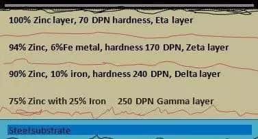 ● 最外层(η)是由100%锌组成,硬度70 DPN