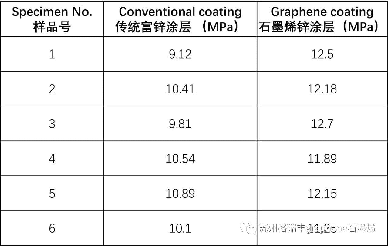 表1示出了6组常规涂层和石墨烯涂层的附着力。从表1中可以看出,石墨烯涂层的最大附着力达到了12.5 MPa,总体平均附着力则达到了12.1 MPa,明显大于常规涂层10.2 MPa的平均附着力,平均附着力提升了约20%。
