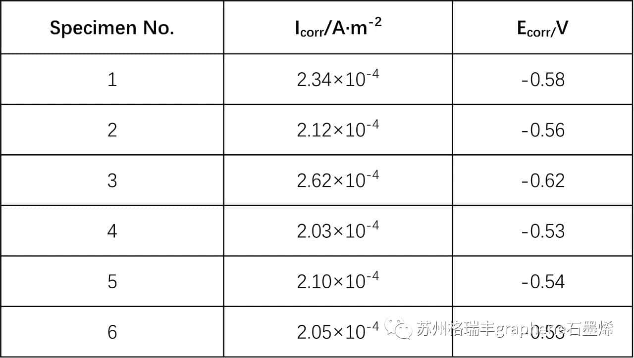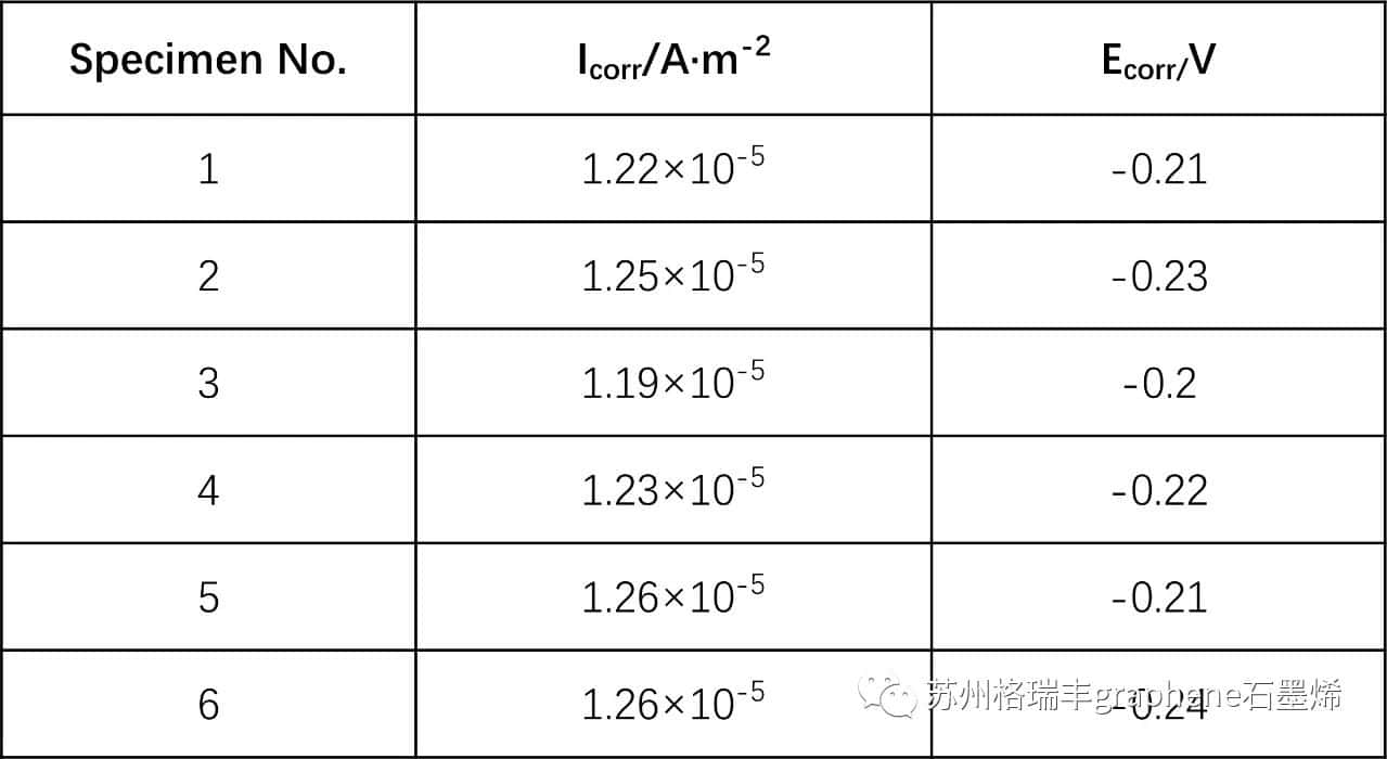 通过塔菲尔切线外延法得出6组常规涂层和石墨烯涂层的腐蚀电流(Icorr)和腐蚀电位(Ecorr),结果如表2和表3所示。从表中可以看出,常规涂层的腐蚀电流在2.05×10-4 A·m-2~2.62×10-4 A·m-2之间;而石墨烯涂层的腐蚀电流范围为1.22×10-5 A·m-2~1.26×10-5 A·m-2,相比常规涂层,石墨烯涂层的腐蚀电流降低了一个数量级,同时其腐蚀电位也逐渐正移,表明石墨烯涂层的防腐效果较好。