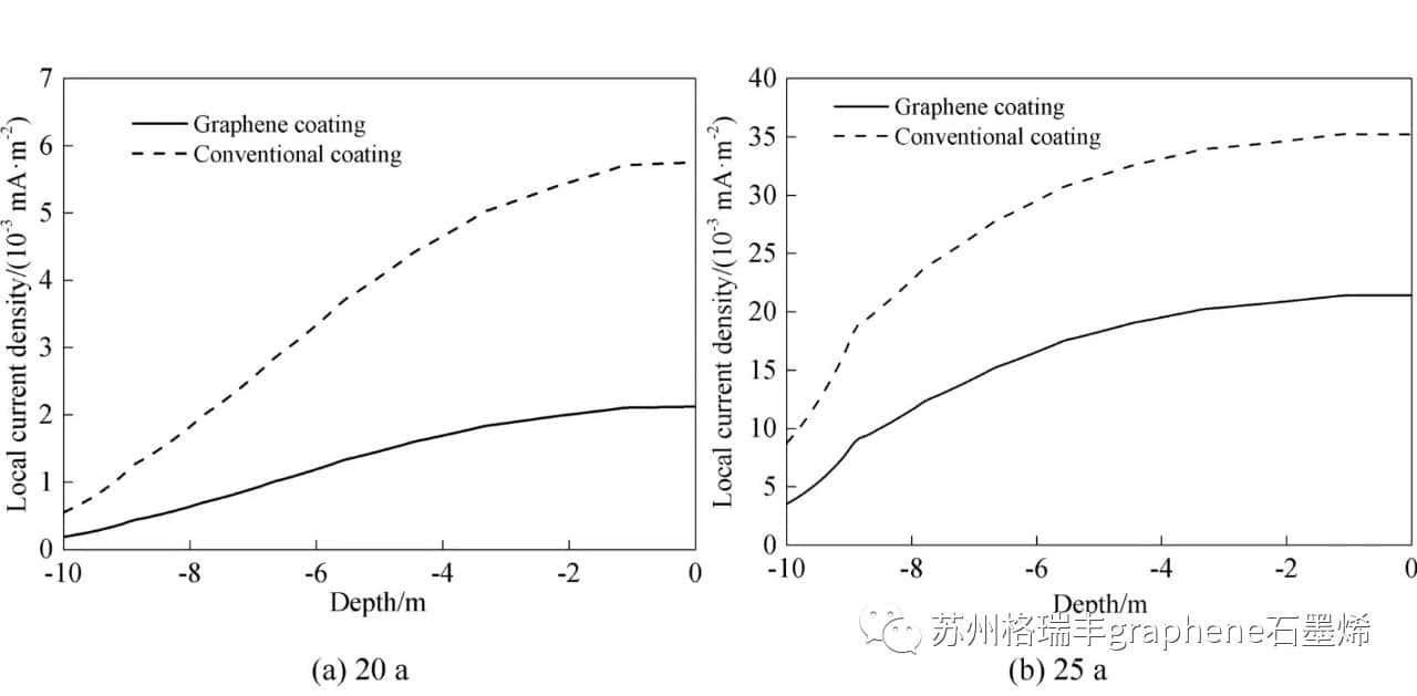 图1示出了20 a和25 a时石墨烯涂层与常规涂层(i0=4×10-5 A/m2)作用下钢管桩表面的局部电流密度,即腐蚀速率.在第20 a时,牺牲阳极未完全消耗殆尽,牺牲阳极作为电位较低的合金材料,使得钢管桩成为阴极材料,其与钢管桩之间的电位差产生一定强度的电流使得钢管桩受到保护,钢管桩局部电流密度处于较低水平。在第25 a时,牺牲阳极已全部消耗,钢管桩的腐蚀速率相较于第20 a时的腐蚀速率有较大的提高,如在海平面处,对于石墨烯涂层和常规涂层而言,钢管桩的腐蚀速率均提高了两个数量级。此外由图可知,泥面处的腐蚀速率较慢。使用石墨烯涂层可显著减小钢管桩的腐蚀速率.在20 a时,石墨烯涂层和常规涂层防护下钢管桩在海平面处的腐蚀速率分别为2.13×10-2A/m2和5.75×10-2 A/m2,在25 a时,则分别为0.214 A/m2和0.352 A/m2,可见在20 a和25 a时,石墨烯涂层防护下的腐蚀速率为常规涂层防护下的37%和61%,这体现出了石墨烯涂层和牺牲阳极联合防护的重要作用。